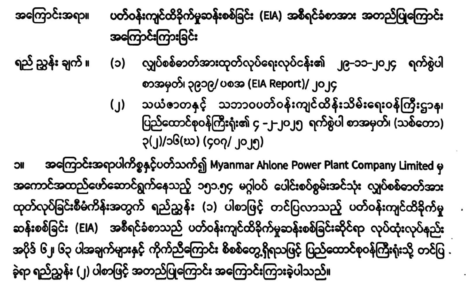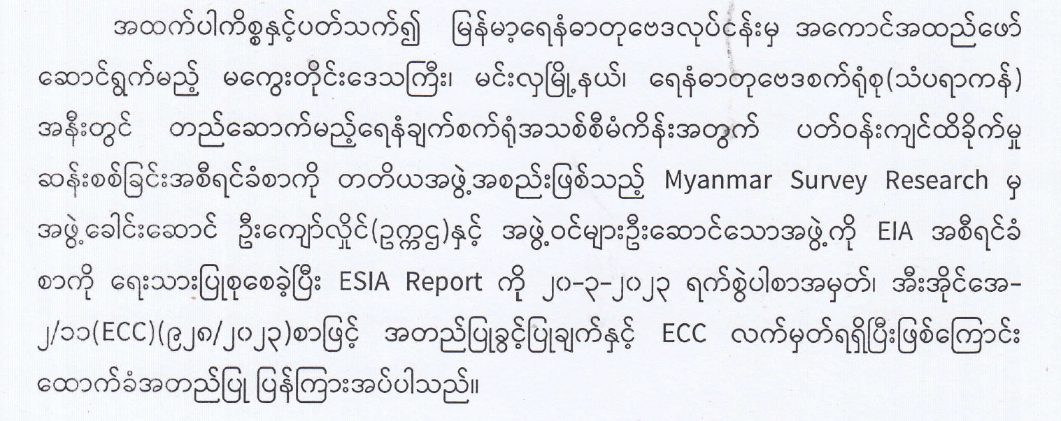 “New Refinery Power Plant Project (Myanmar Petrochemical Enterprise) confirmed that MSR successfully conducted and prepared the EIA report, which was approved by MONREC in 2023.”
