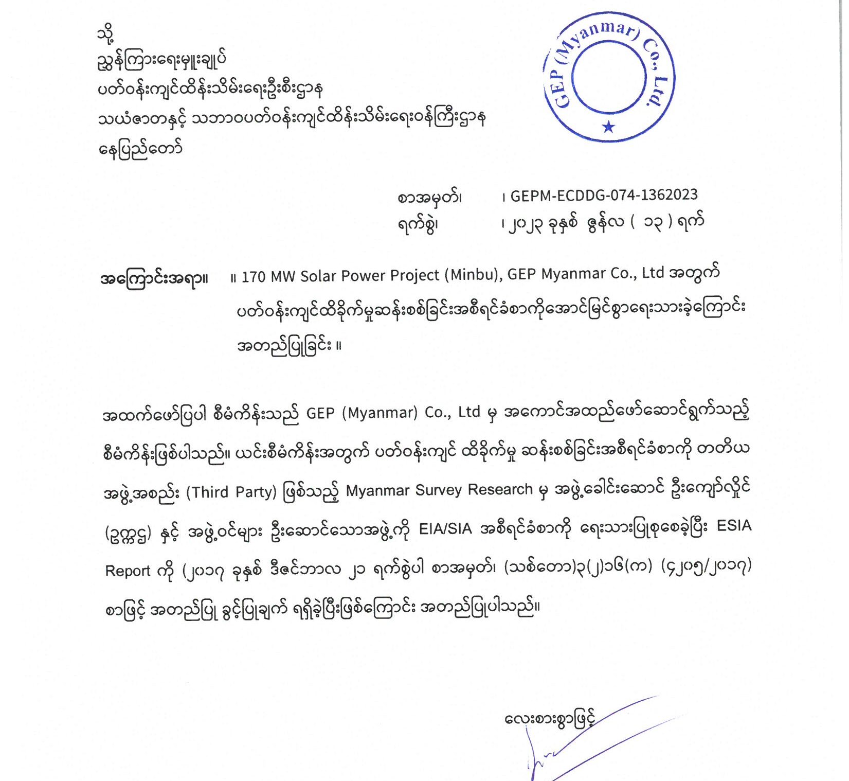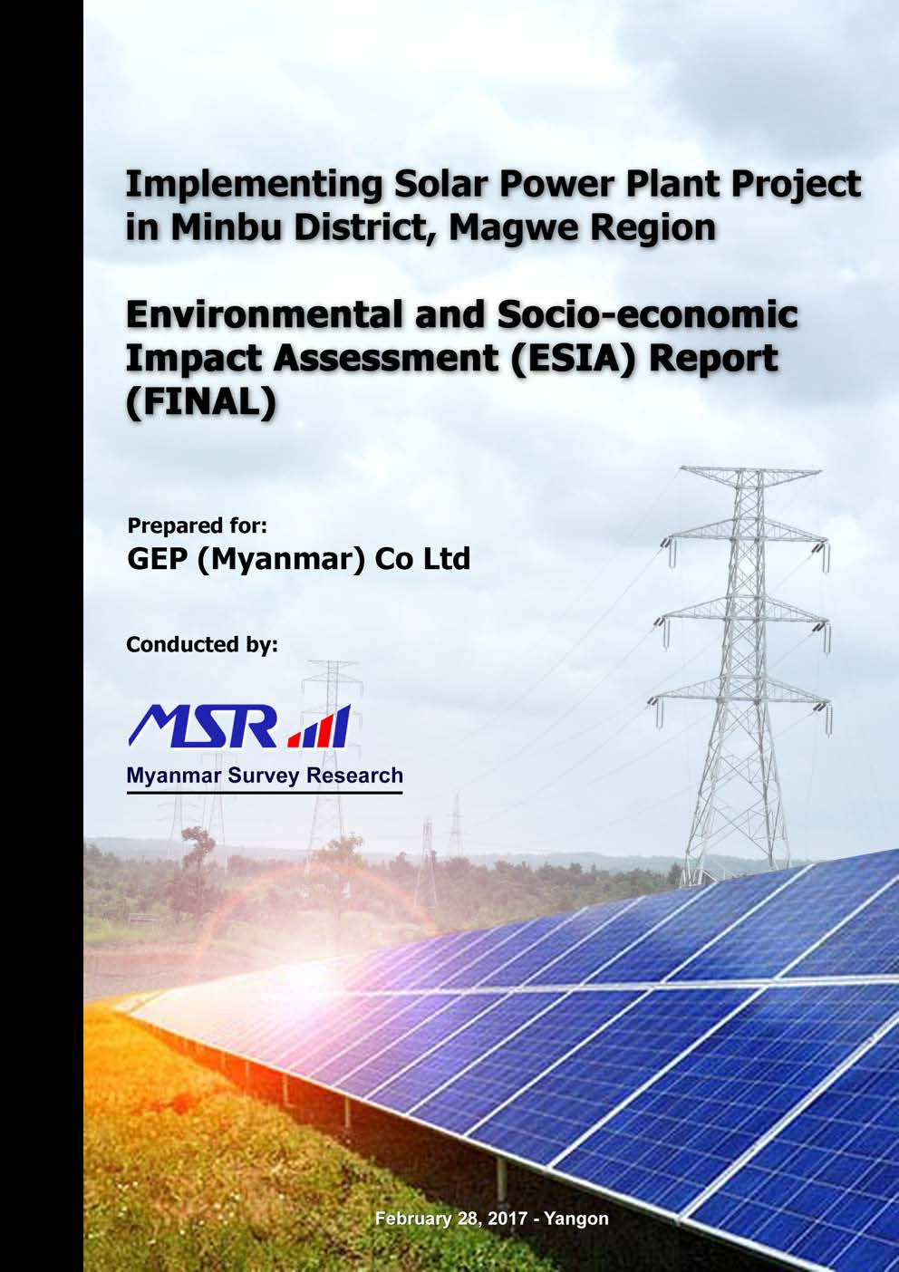 ”Minbu Solar Power Plant (170 MW) Project (GEP (Myanmar) Co., Ltd.) confirmed that MSR successfully conducted and prepared the EIA report, which was approved by MONREC in 2017”.