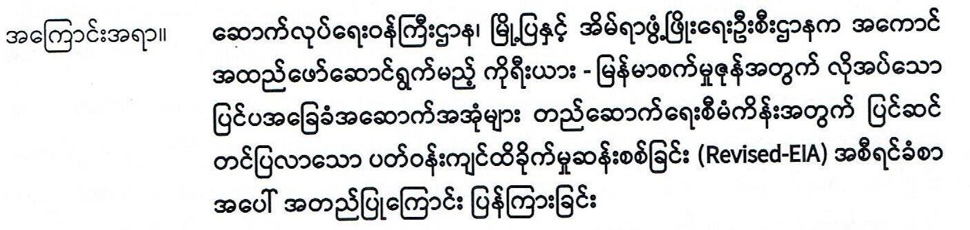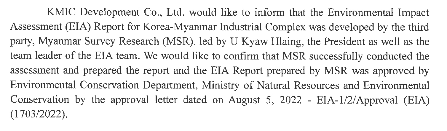 “Korea-Myanmar Industrial Complex (KMIC Development Co., Ltd.) confirmed that MSR successfully conducted and prepared the EIA report, which was approved by MONREC in 2022.”