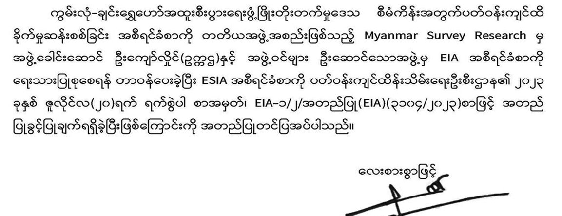 “Kunlong-Chineshwehaw Special Economic Region Development (Chit kyi Yae Co., Ltd.) confirmed that MSR successfully conducted and prepared the EIA report, which was approved by MONREC in 2023.”