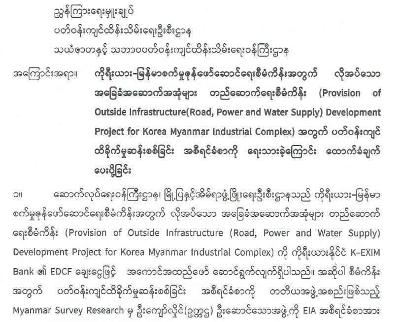 ”Provision of Outside Infrastructure (Road, Power Transmission Line, and Water Supply) Development Project for the Korea-Myanmar Industrial Complex (Department of Urban Housing Development, MOC) confirmed that MSR successfully conducted and prepared the EIA report, which was approved by MONREC in 2023”.
